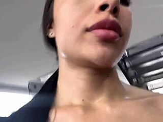 Sexy latina squirts hard in gym bathroom... instructor almost catches her! 💦😏