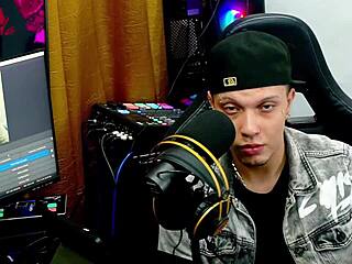 Elo from the podcast sucks Sara Blonde's natural tits in the spicy room