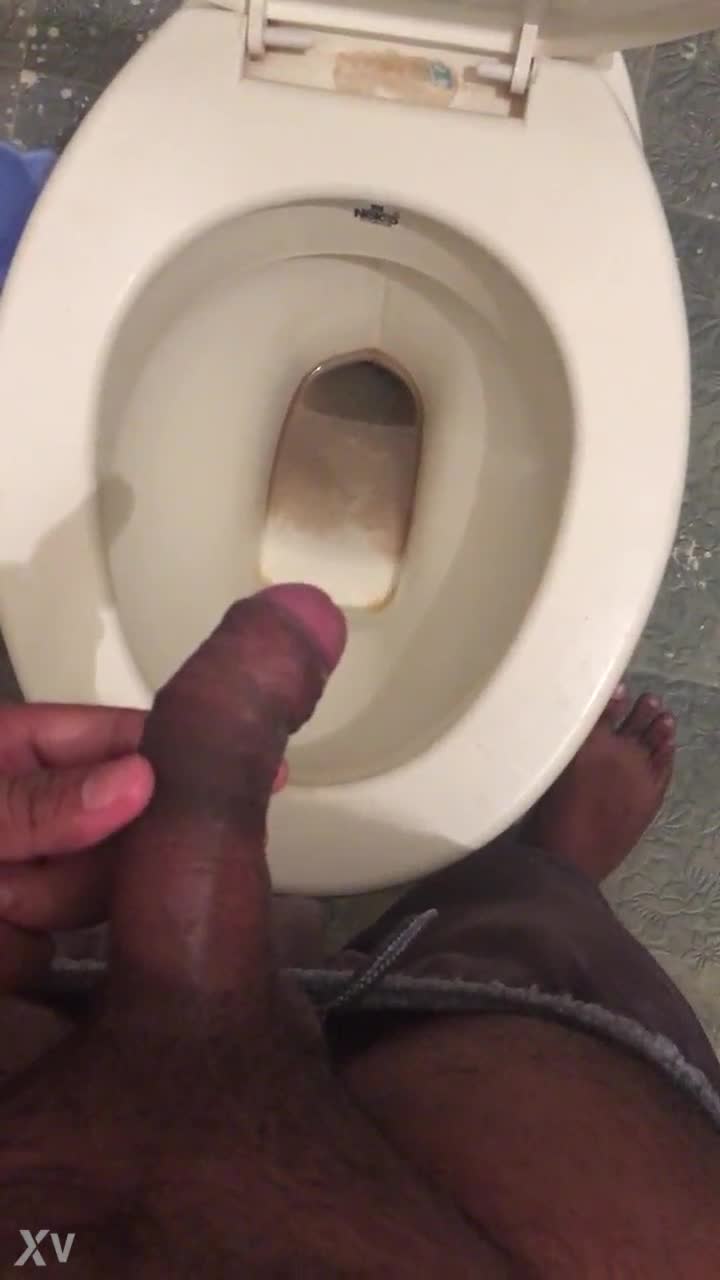 She squats low letting her monster cock drip cum while peeing nice and steady
